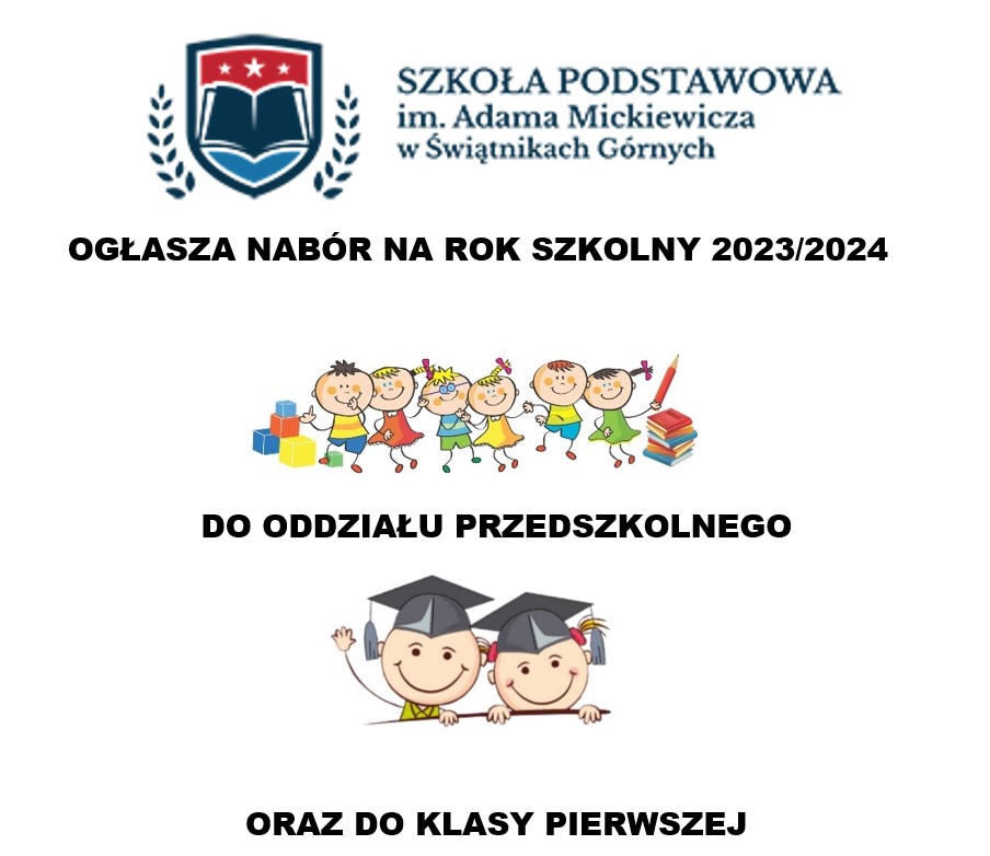 Prosimy o zapoznanie się ze szczegółowymi informacjami, terminami i procedurami rekrutacji oraz wymaganymi dokumentami dostępnymi na stronie internetowej szkoły www.spswiatnikigorne.eu w zakładce REKRUTACJA 2023/2024 lub na tablicy ogłoszeń przy wejściu głównym do naszej szkoły.
