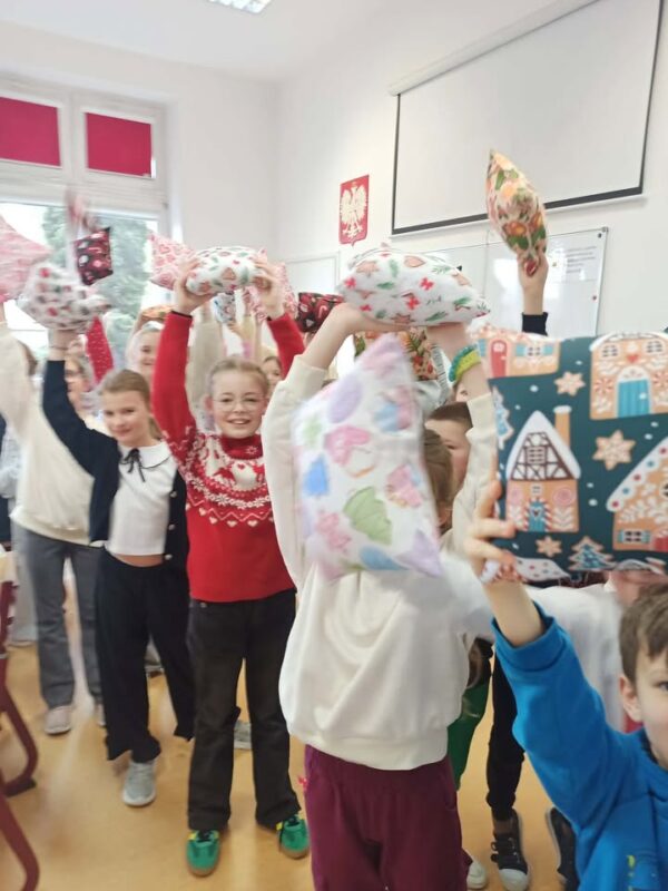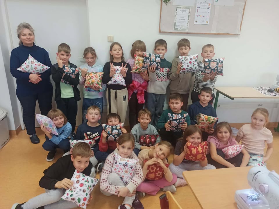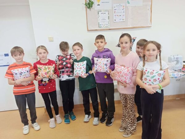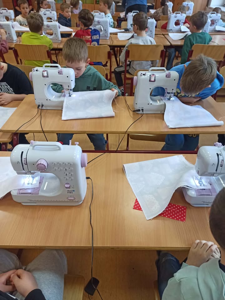 Podczas zajęć dzieci zapoznały się z budową maszyny do szycia oraz zasadami jej obsługi. Każdy uczeń samodzielnie uszył dla siebie poduszkę, którą następnie wypełnił mięciutkim puszkiem.