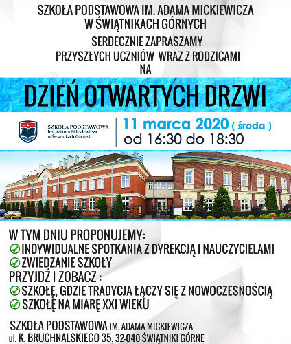 Szkoła Podstawowa im. Adama Mickiewicza serdecznie zaprasza przyszłych uczniów wraz z rodzicami na Dzień Otwartych Drzwi.